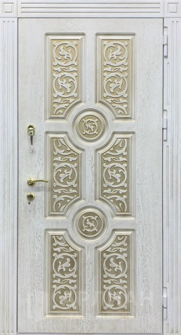 Стальная дверь белого цвета с панелью МДФ и молдингом №96